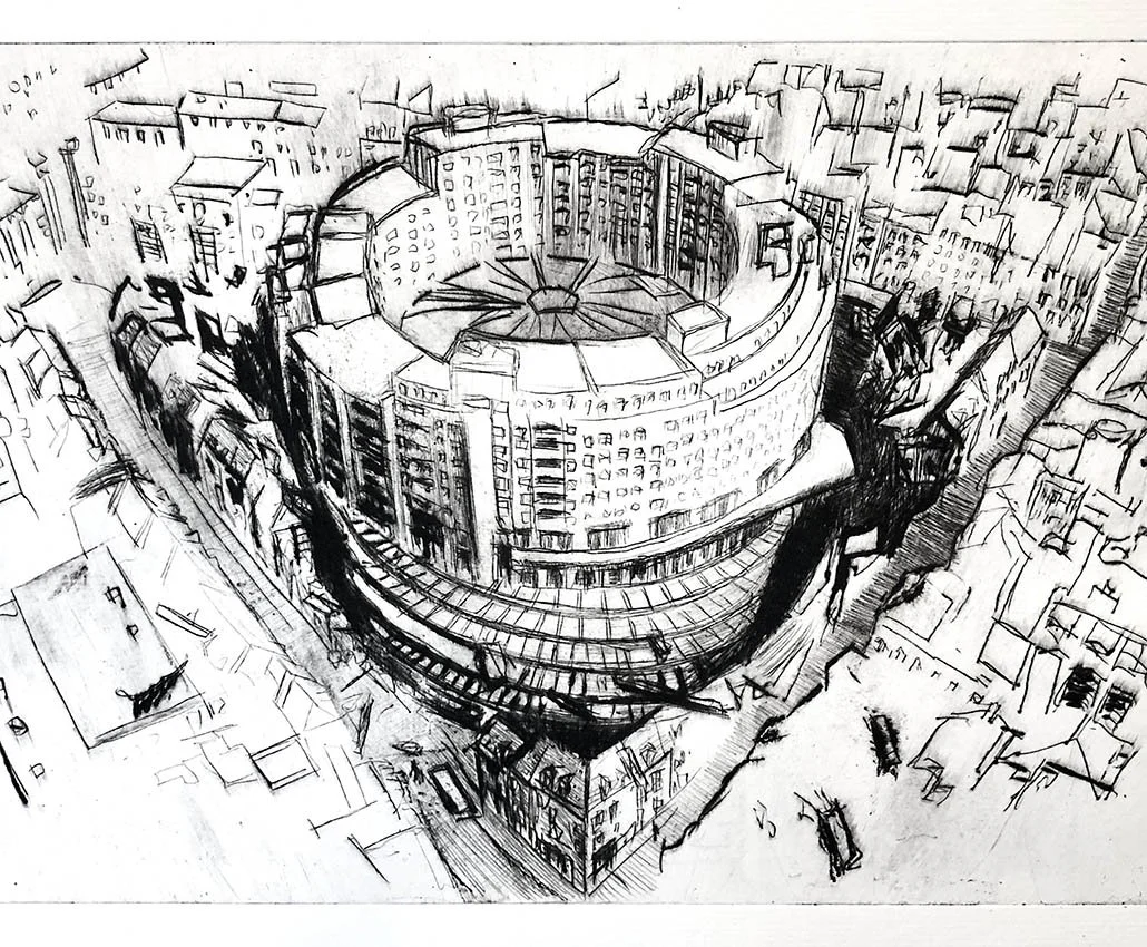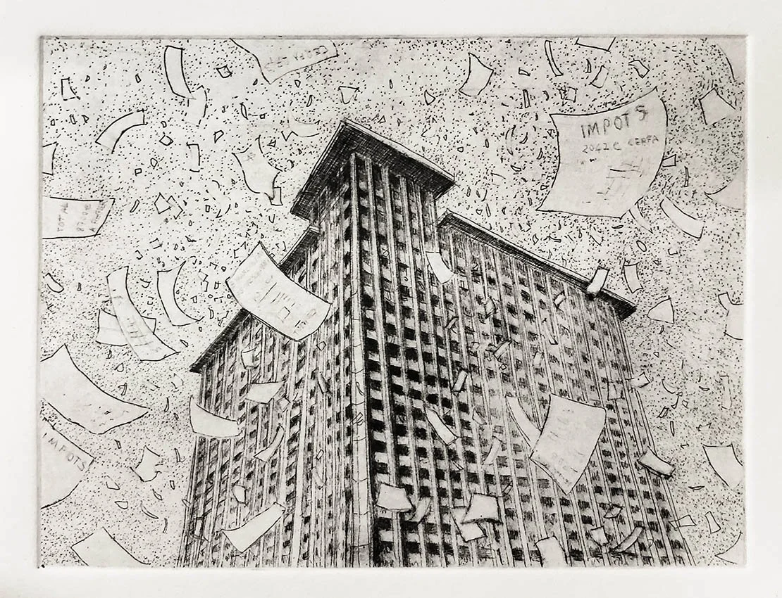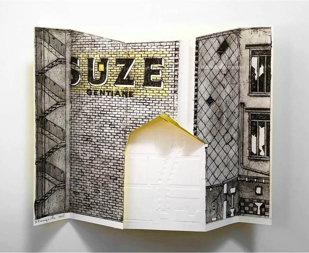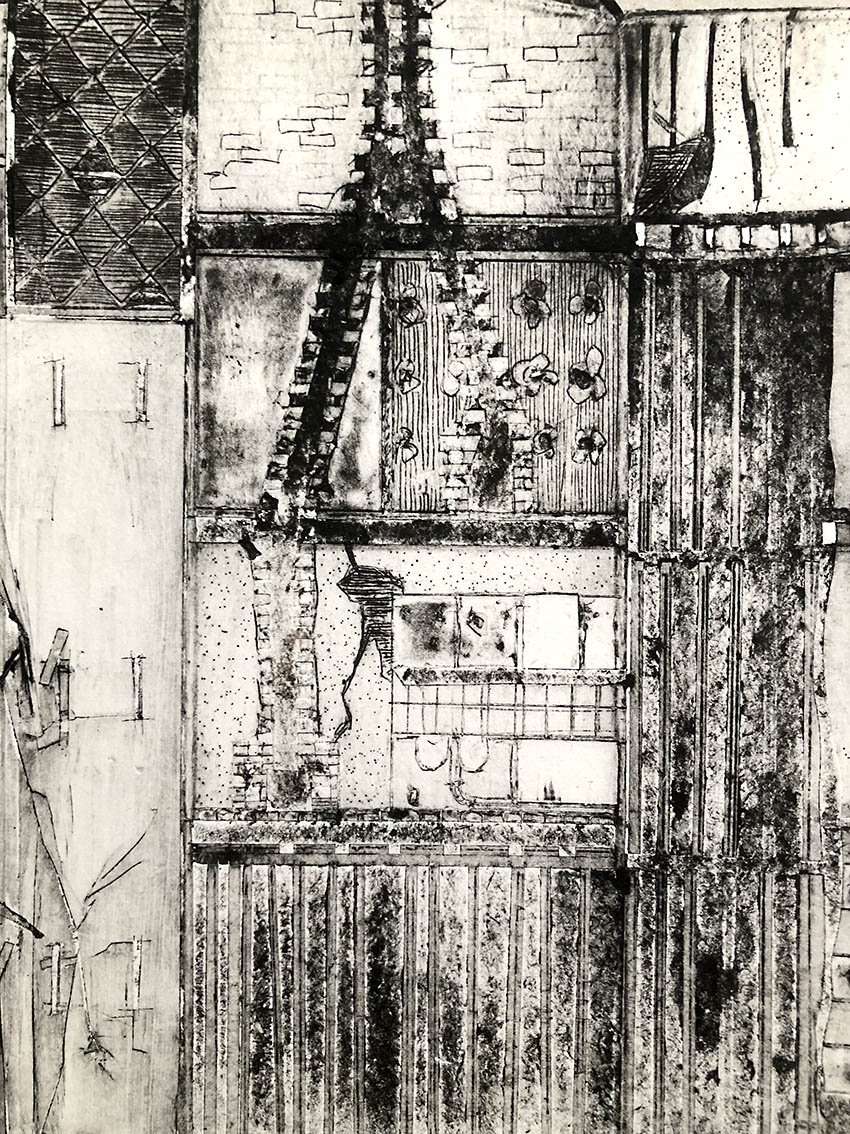 Gravures à la pointe sèche sur emballages Tetrapak. La pauvreté de ce matériau de récupération rejoint la vétusté des bâtiments représentés.