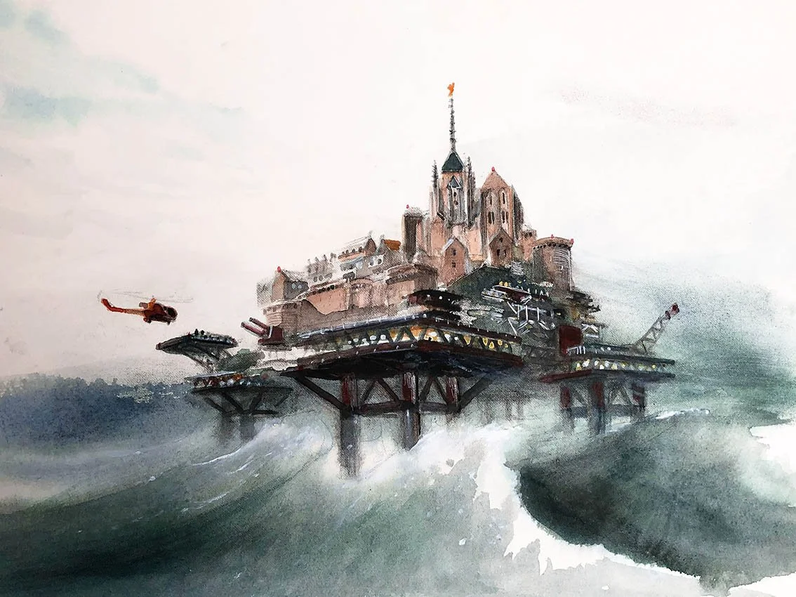 Face à l’envasement inéluctable de la baie, le Mont-Saint-Michel ne sera bientôt plus entouré d’eau. Pour lui redonner son véritable statut d’île, une réplique à l’identique est construite sur une plateforme offshore dédiée. Parfaitement sécurisée, elle devient le lieu privilégié des grands sommets mondiaux.