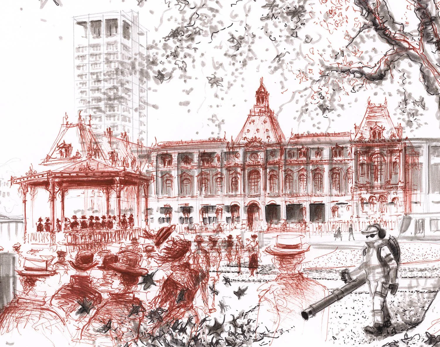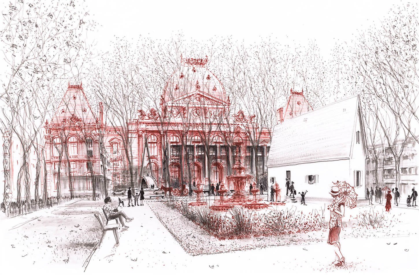 Les espaces publics sont le théâtre de la vie quotidienne (piétons, véhicules, activités, kiosques, marché, ...). Des rencontres fortuites entre habitants d’autrefois et passants actuels sont intégrées au dessin, avec une pointe d'humour.