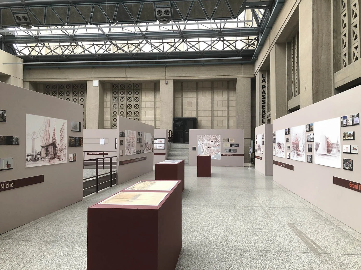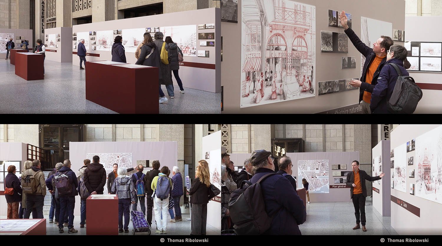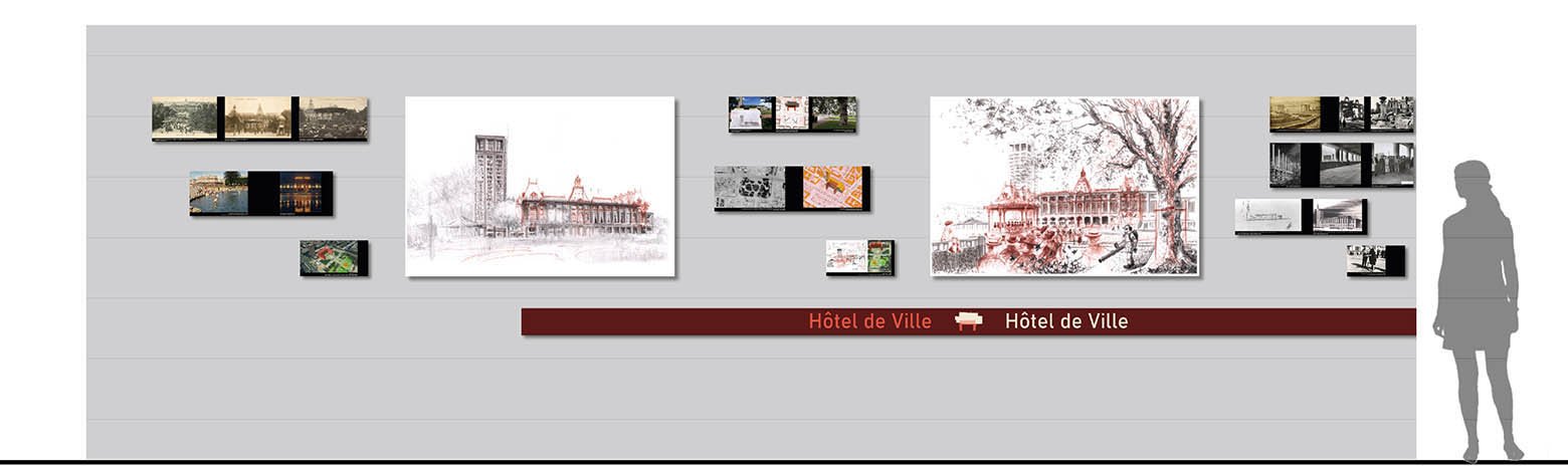 L’exposition s’articule autour de tirages grand format de dessins réalisés sur site, sur lesquels se superpose « la ville d’avant » datée vers 1900, période riche en archives photographiques.