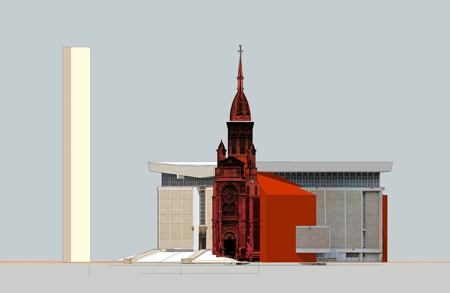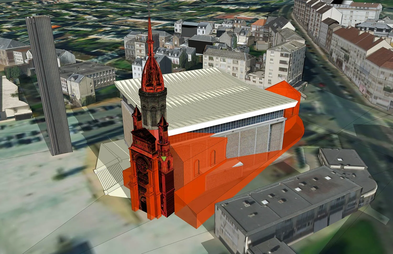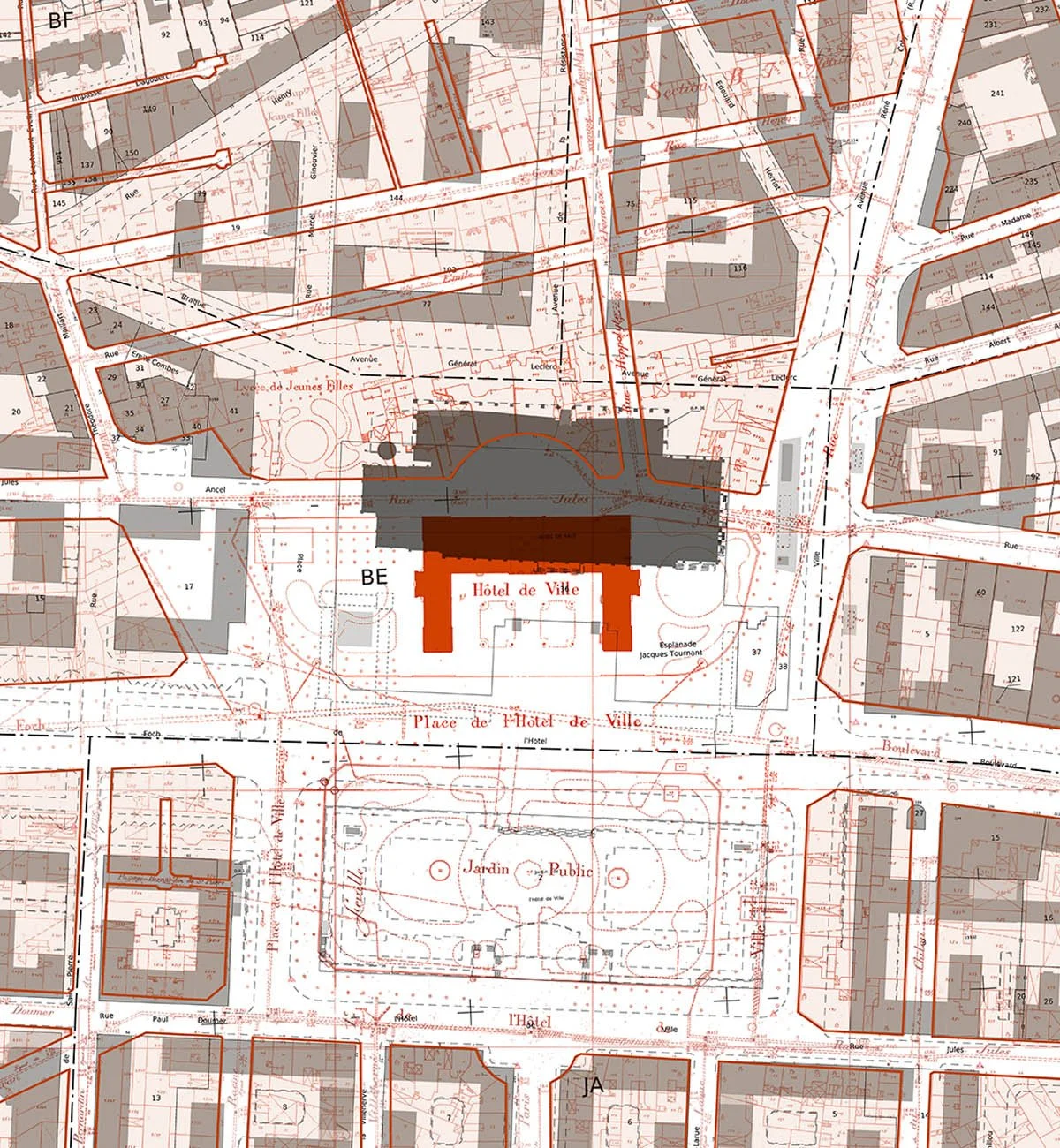 Chaque bâtiment est présenté dans un périmètre élargi, intégrant les espaces publics adjacents (place, parvis, avenue, ...).