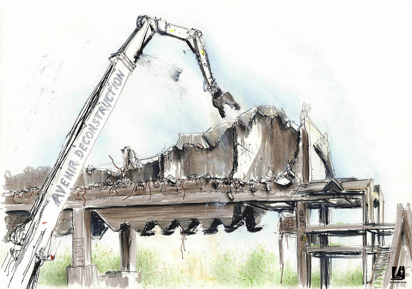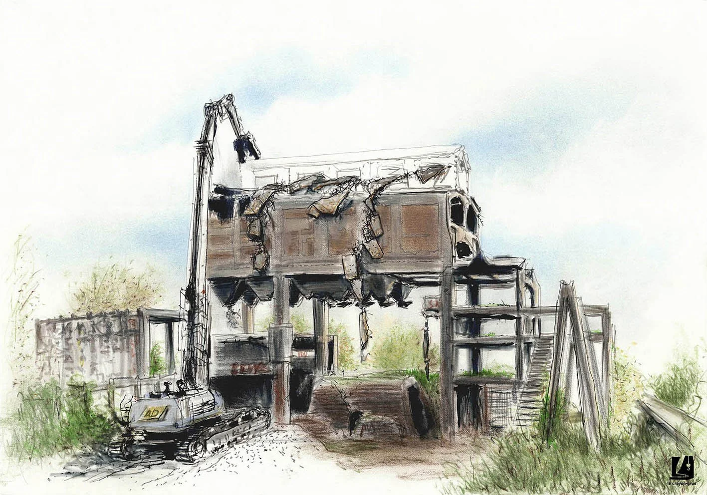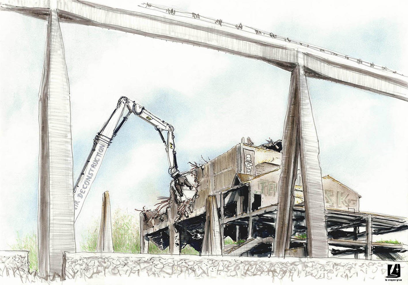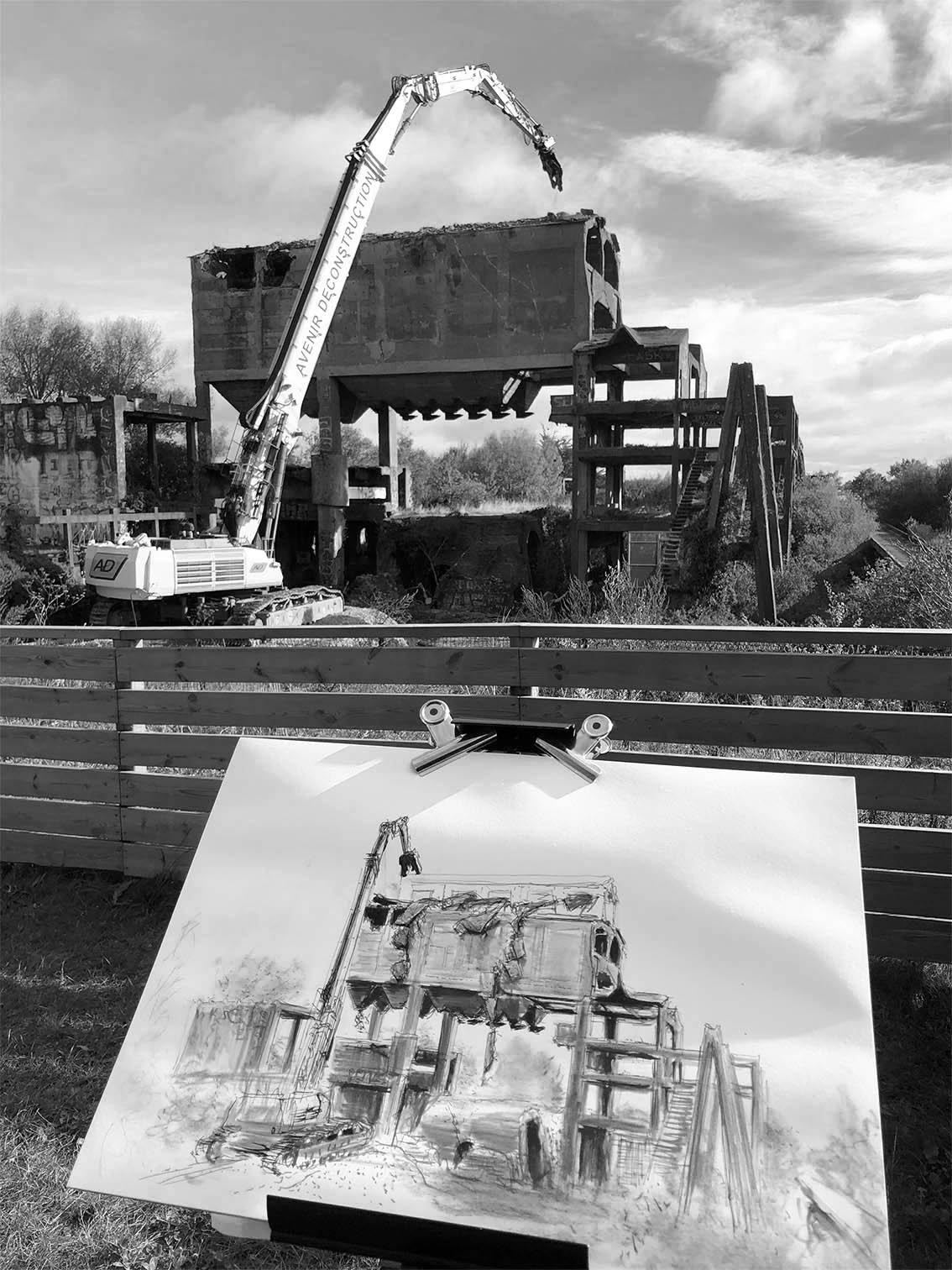 Commande du service Culture et Patrimoine de la mairie de Trignac d’une série de croquis réalisés sur site, pendant le chantier de déconstruction.